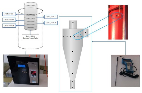 The cyclone used in experiments is illustrated in Figure 1a. This cyclone is a high-efficiency Stairmand cyclone with a tangential entrance section. The dimensions of the cyclone’s different sections are presented in Figure 1b. Additionally, cyclone separator dimensions are presented in Table 1. Velocity was measured by a hot-wire anemometer, whereas the pressure drop was measured using a differential pressure gauge. The experimental set-up is shown in Figure 2.