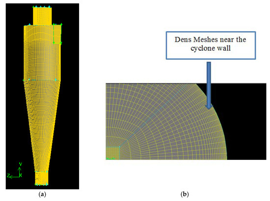 The 3D computational model using in the simulation is shown in Figure 3. A grid refinement was employed in the cyclone vortex core to resolve the reverse vortex flow feature correctly. Four different mesh densities (i.e., coarse = 425,700, medium = 612,600, fine = 812,410, and very fine = 1,146,100) were used for the grid independence test. The results showed that the discrepancy among pressure drop between the gas inlet and vortex finder outlet was less than 2.5% when the grid cells above 612,600 were used. Therefore, the mesh containing 612,600 cells was used in the simulations.