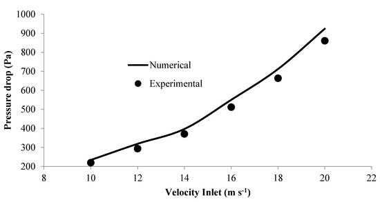 Zhou et al. indicated that increasing the inlet velocity increases the pressure drop. In their work, four levels of inlet velocities, including 10, 15, 20, and 25 m s−1 were evaluated [29].