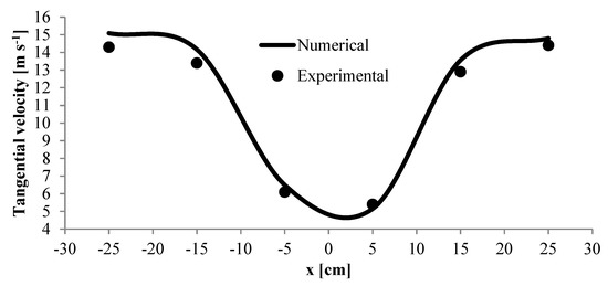 CFD simulations must be validated to guarantee the results. Then, the pressure drop, and inlet velocity were presented in both experimental and numerical results. Figure 4 illustrated the experimental and numerical pressure drop at the barrel section of the cyclone separator. There is good agreement between numerical and experimental data. In both, with increasing inlet velocity, the pressure drops increased. It was concluded that the created simulation was reliable to extract other desired parameters of cyclone performance. Additionally, validation between numerical and experimental data for the tangential velocity in vin = 16 m s−1 is presented in Figure 5.