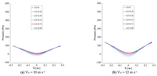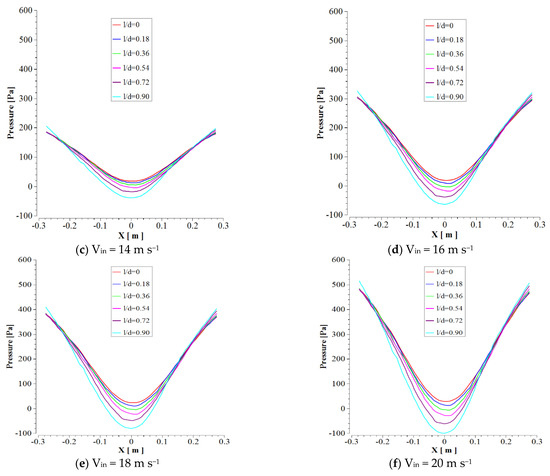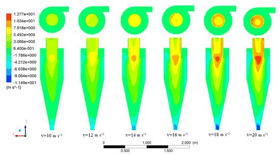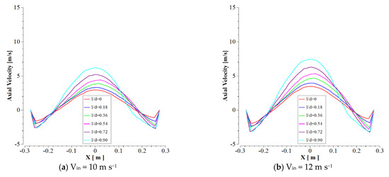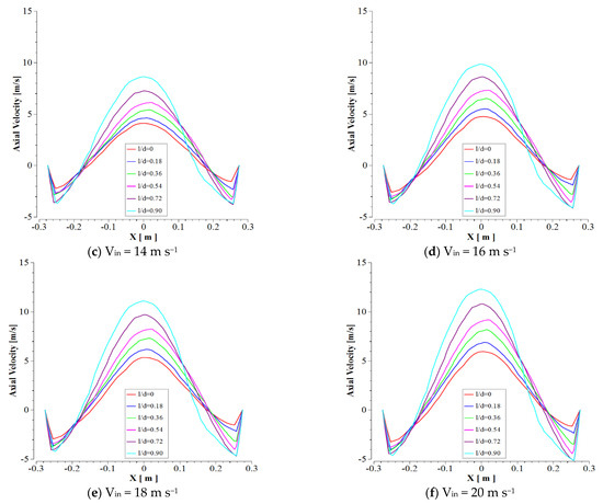 An essential issue in the cyclone body is the variation of axial velocity in the x-direction. As shown in Figure 7, the variations of axial velocity in several cyclone cylinder heights were presented. The plots indicate a decreasing–increasing treatment concerning axial velocity in various ratios of heights, so that from the wall to a small distance, the axial velocity was decreased and then dramatically increased to the maximum value in the center section of the cyclone. On the positive side of the axial axis, the treatment reverses and significantly decreases, and finally increases near the cyclone wall. With increment l/d ratio value and inlet velocity, maximum values of axial velocity increased.
