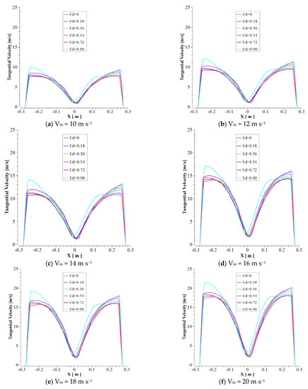 Additionally, the change in the tangential velocity profile pattern is insignificant in various inlet velocities. In Figure 10, the variations of the three mentioned sections are illustrated in various inlet velocities and l/d ratios. Xiang and Lee indicated that decrement in tangential velocity is responsible for the lower separation efficiency, whereas the higher tangential velocity will not necessarily lead to higher separation efficiency [25].