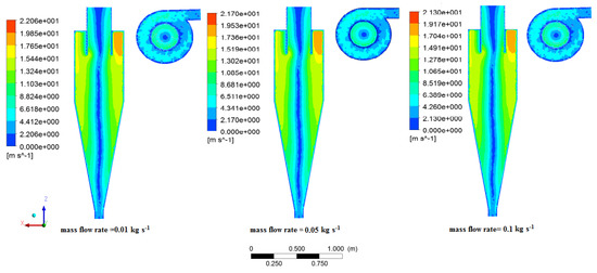 In the different situations of axial velocity contours in various mass flow rates, applying the different mass flow rates has a direct effect on tangential velocity. Referring to Figure 11, the tangential velocity reduced to 21.7 m s−1 for the mass flow rate of 0.5 kg s−1 (decrement of 0.36 m.s−1), whereas this decrement was 0.4 at mass flow rate of 0.1 k/s and the axial velocity reached 21.3 m s−1. Increasing the mass flow rate regarding constant inlet velocity (16 m s−1) resulted in the decrement of the tangential component of the velocity field. These patterns of contours and plots for static pressure, axial and tangential velocity have been presented in Elsayed and Lacor’s work about optimization of the cyclone [7,26], which were similar results to this research.