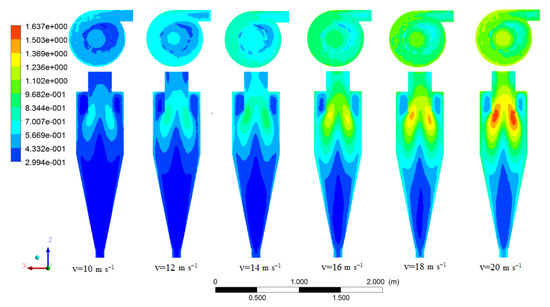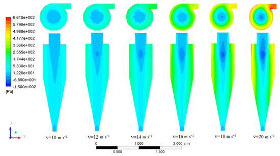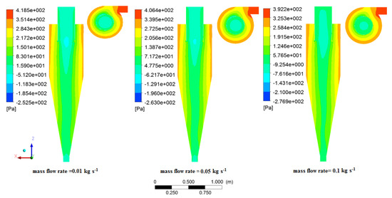 The static pressure contours can be discussed in three main sections of cyclones. High static pressure values were obtained in the top section of the cyclone wall and cyclone inlet due to the high friction in this area. Low pressure drop values were attained in the axis of the vortex finder as the reverse flow was created in this section. Intermediate values of pressure drop occurred in the area between the two mentioned sections due to the attenuation of the intensity of the mentioned parameters. As a significant point, the minimum pressure occurred in the middle part of the vortex finder (Figure 15). This trend (increase in the pressure drop with increasing inlet velocity) was reported in several studies [3,27,28]