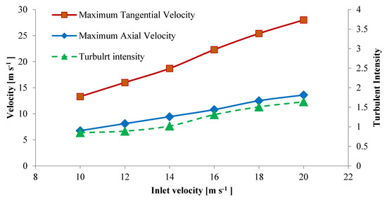 A comparison trend of variations of maximum tangential velocity, axial velocity, and turbulent intensity of mentioned parameters in various inlet velocities is presented in Figure 13. The increase of tangential velocity is sharper with inlet velocity increase, while both axial velocity and turbulent intensity increased moderately with increasing inlet velocity.