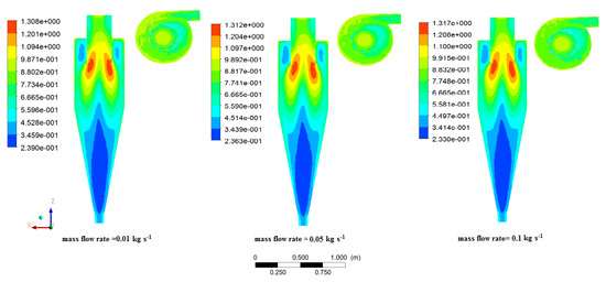 The use of various mass flow rates in the simulation has an insignificant effect on axial velocity contours. Referring to Figure 8, the axial velocity distribution, as well as its value in different mass flow rates, were the same for 0.01 and 0.5 kg s−1 mass flow rates. Then, the comparison of results between 0.5 and 0.1 indicated that a slight change occurred in this range. The main reason for the low impact of mass flow rates was a constant value of inlet velocity as the axial velocity was mostly affected by the volumetric flow rate (air flow rate).