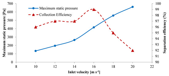 Maximum static pressure and separation efficiency in various inlet velocities.