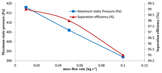 Both Static pressure and separation efficiency were decreased by increasing the mass flow rate (Figure 18). The increasing mass flow rate regarding constant inlet velocity is the main reason for this treatment (16 m s−1). Increasing the mass flow rate leads to an increase in the particle velocity and a reduction in the friction and pressure drop. As shown in Figure 19, a reasonable compromise should be made between pressure drop and separation efficiency to obtain the best performance.