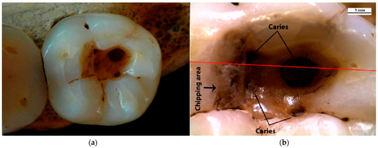 Top view of the lower right third molar (RM3) of the Villabrun man; (a) occlusal view; (b) detailed view of the occlusal cavity with four carious lesions and the area of chipping on the mesial wall; a red line directed mesially–distally runs through the major carious lesion [1].