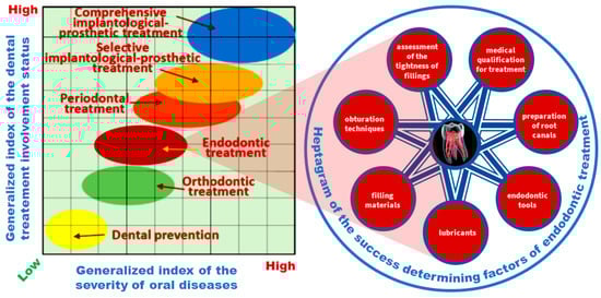 The DALY index may reach even 40–50 years [2]. It has a major impact on many aspects of social and economic life, although the problem is underestimated by many individuals and by many governments [47]. It is imperative to recognize that the public’s overall health is closely related to oral hygiene, prevention, and effective treatment of oral diseases at the earliest possible stage of the disease once it has developed. The most popular and most frequently used treatment method is conservative treatment, which consists of preparing carious lesions and then the direct reconstruction of hard tooth tissues using filling material. Progress in this regard is obvious. If the disease is more advanced, endodontic treatment is needed, which is shown schematically in Figure 2, which includes the matrix of advancement and treatment of oral diseases according to the general authors’ concept [2].