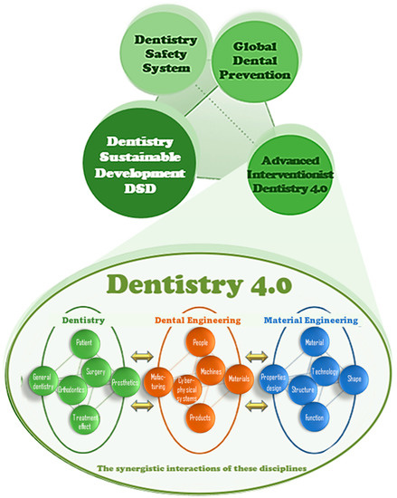 The matrix in Figure 2 is in the Dentistry Sustainable Development (DSD) > 2020 model, consisting of three component models: Global Dental Prevention (GDP), Advanced Interventionist Dentistry 4.0 (AID 4.0), and Dentistry Safety System (DSS) [2,54,55,56,57] (Figure 3).