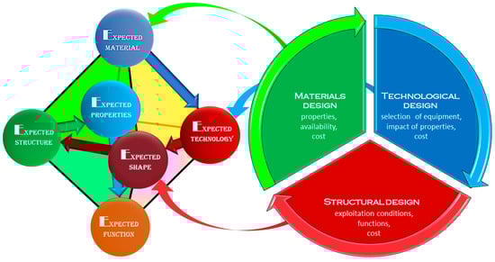 Each scientific work in the field of material engineering, including this one on endodontic tools, requires respect for the material engineering paradigm, i.e., in general, the study of cause–effect relationships between the type and chemical composition of the material, shaping the form and geometric features of the product, as well as its structure in the technological process and their influence on the physicochemical properties, including mechanical properties, to ensure the assumed operational functions of the product manufactured from a given material. It seems to be obvious to every materials science expert, but it may cause some surprise among dentists. Therefore, it should be remembered at this point in this paper that this paradigm comes down to the principle of six expectations, 6xE, expressed in octahedron and taking into account the basics of engineering design composed of three inseparable elements, including material and technological design [66,146,147,148] (Figure 4).