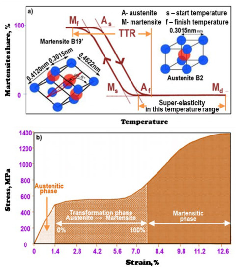 The source of shape memory and superelasticity effects is thermoelasticity and reversible martensitic transformation in nearly stoichiometric Ni–Ti alloys, even if their composition differs relatively slightly from the stoichiometric one towards the advantage of nickel [297]. The properties of nitinol alloys significantly depend on the conditions of heat treatment [298,299] and the structure that arises as a result of technological processes, especially the refinement of the austenitic matrix grain [300,301], including as a result of drawing [302] or cold rolling [303], as well as high-pressure torsion (HPT) [304] and equal channel angular pressing (ECAP) [305]. The course of the dispersion precipitation processes of Ni4Ti3 [306,307,308] in austenite and the course of the martensitic transformation [308,309] are important.