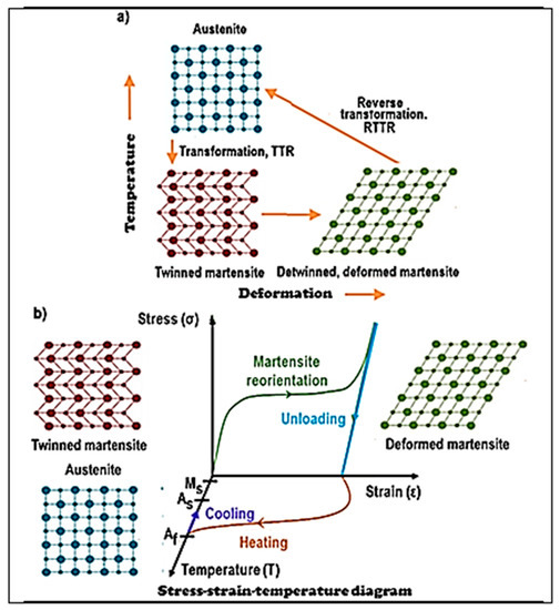 Schemes: (a) transformation of austenite by twinning into martensite in the RTTR temperature range, martensite reorientation through detwinning and reverse martensitic transformation in the RTTR temperature range; (b) stress–strain–temperature influence on the course of nitinol transformation.