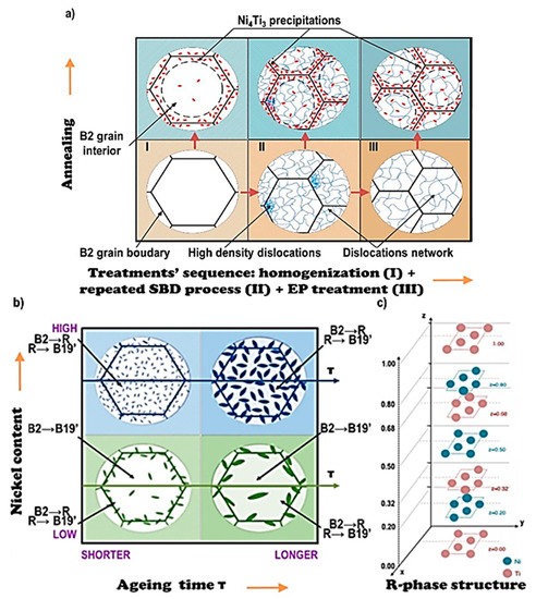 Schemes: (a): the annealing sequence, stretch–bending deformation (SBD), and electric pulse treatment (EPT) on obtaining the optimal grain size of the bound austenite and the extraction of the metastable Ni4Ti3 phase; (b): the influence of the nickel concentration of the annealing time on the precipitation processes of the metastable Ni4Ti3 phase and the course of transformations B2 → B19′ and B2 → R and R → B19′; (c): the crystallographic structure of R phase.