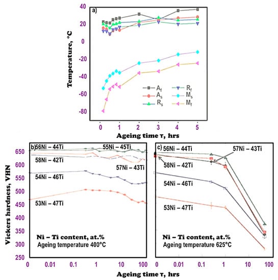 The significant stress field generated in this way enables a two-variant course of the directly or two-stage transformation [365,366] associated with increasing the temperature of the R phase transformation [368]. The necessary condition to ensure the course of the B2 → R transformation is the damping of the direct transformation according to the scheme B2 → B19′ [374]. The opposite is the case with the precipitation of coarse-grained precipitations of the Ti3Ni4 phase, which has little effect on the formation of the R phase in the absence of coherence. Therefore, the growth and coagulation of Ti3Ni4 precipitations and the related loss of coherence favor the direct transformation B2 → B19′ [189,391,392]. Therefore, with the extension of the ageing time and the increase in the ageing temperature, the precipitation hardening mechanism by Ti3Ni4 phases is less effective [299], which reduces the hardness [299]. Under such conditions, the proportion of Ni4Ti3 decreases, or this phase decomposes into a mixture of Ni3Ti2 and Ni3Ti [393]. The distinctive parabolic character of hardness changes with the extension of the annealing time is related to the ageing effect [299]. Under these conditions, nitinol exhibits only a one-sided shape memory effect [372].