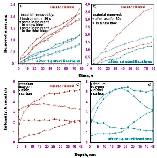 - Schafer, E. Effect of sterilization on the cutting efficiency of PVD-coated nickel-titanium endodontic instruments. Int. Endod. J. 2002, 35, 867–872. [Google Scholar] [CrossRef] [PubMed]