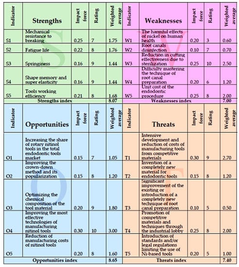 Nevertheless, the paper also reviews the results of various tests on the performance of tools made of nitinol made by dentists. Despite the lack of cognitive values, such a review may be useful for dentists, pointing to the functional properties of tools from different companies. It is worth adding that the main recipients of this paper are certain engineers, tool designers and manufacturers, PhD students, and students of materials and manufacturing engineering. Still, dentists will also certainly reach for it. It is this practical information that can be helpful to them in clinical practice. As each sterilization process causes irreversible degradation of each tool, the problem has been analyzed in detail in this paper, broadly illustrated by the results of experimental studies, including caused by sterilization necessary for clinical reasons. The mechanical preparation of root canals requires eliminating microorganisms and removing inorganic and organic debris from the root canals. Therefore, it is necessary to irrigate the root canals with appropriate rinsing fluids after each inserted instrument. However, these issues do not fall within the scope of this paper. The summary of all the conducted literature analyzes is an SWOT analysis of strengths, weaknesses, opportunities, and threats, and is a forecast of the development strategy of this material in a specific application, such as endodontics. The methodology used and described in earlier own work was used [66].