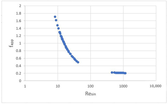 The friction factor, fapp, determined in each experimental point with Equation (17), was plotted vs. Resine (Figure 2) and compared with the model, on the whole range of Resine = 8–1137. The model fits almost perfectly at Resine > 25 with experimental data of Muley et al. [13] and Heavner [31] but has errors of 5–15% at Resine = 9–25. These errors can be explained by the different geometry (the aspect ratio b/l > 0.5 in contrast with b/l < 0.5 for all previous experiments), which can affect the friction coefficients at Re sine < 25.