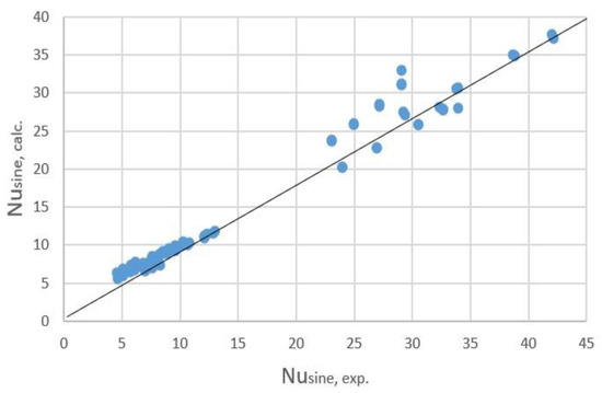 Comparison between the experimental Nusine values and those computed with the model (Equation (10)).