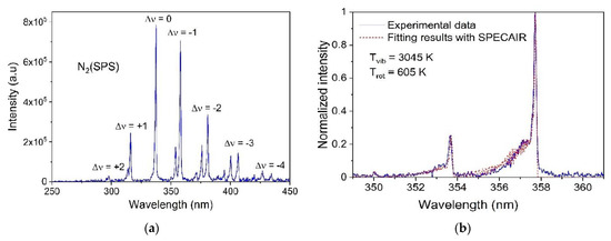 The OES experiments for the DBD plasma were performed along the horizontal axis in the 2 mm gap between the HV electrode and the epoxy surface. The wide-band measurements showed no peak appearing above 450 nm; thus, we focused on the spectral region 250–450 nm. As shown in Figure 2a, the emission spectrum is over dominated by the second positive system (SPS) N2(C-B) molecular ro-vibrational bands in the 300–410 nm range [37,38,39]. The OH(A-X) molecular band in the 306–310 nm range was also detected; however, its intensity was too low compared to the N2(C-B). Thus, the vibrational (Tvib) and rotational (Trot) temperatures were determined for N2(C). The results for the Δν = −1 vibrational band presented in Figure 2b show a relatively good agreement between the experimental data and the theoretical spectrum, suggesting that the excitation equilibrium is reached for both rotational and vibrational levels in the DBD plasma. The vibrational and rotational temperatures have been estimated as Tvib = 3145 ± 100 K and Trot = 605 ± 50 K, respectively. The significant difference between rotational and vibrational temperature indicates that the DBD plasma does not have sufficient relaxation processes to reach a local thermal equilibrium (LTE) in these experimental conditions.