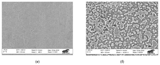 Scanning electron microscopy (SEM) was applied to evaluate the effect of plasma treatments on epoxy surface morphology. Figure 5 presents the SEM images of untreated epoxy as well as 300 s treated samples with Gliding Arc and DBD plasma devices. For each condition we selected two images at different magnification to be presented, namely, ×500 and ×20,000, aiming to distinguish the possible effect of plasma treatment in micro and nano-scale. Figure 5a,b shows the surface of the untreated epoxy sample where we observe the almost smooth morphology despite the material spatial in-homogeneities. Similar morphologies are observed for the Gliding Arc treated samples as well, as shown in Figure 5c,d. This result is quite reasonable considering that the sample treatment takes place in the downstream of the Gliding Arc reactor. Concerning the air DBD treated samples, although Figure 5e shows no significant effect on the surface morphology in the micro-scale, the higher magnification image in Figure 5f revealed nano-roughness formation. The nano-topography combined with the enhanced oxidation of air DBD treated epoxy surfaces are mostly responsible for the initial superhydrophilic and the stable in-time hydrophilic properties.