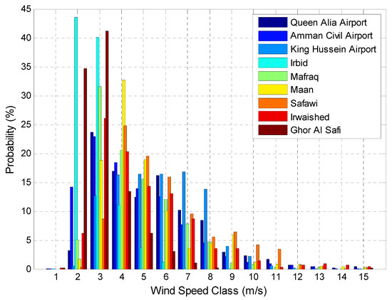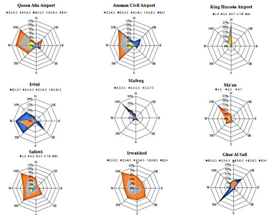 The wind directions were determined based on the available wind data. The wind rose was drawn for each site, as shown in Figure 2. A closer inspection of this figure shows that the most prevailing direction was north–west, with an occurrence rate of 26.29% at all sites. Wind blowing from the east featured the lowest occurrence rate among all the directions, with only 3.87%. The occurrence rate of the wind blowing from the north at King Hussein Airport was the highest, with a percentage value of 68.55%. In general, knowing the prevailing wind direction in a specific wind site offers an indication as to the correct direction of the installed wind turbine, which should be ranged from northwest to southwest in most sites.