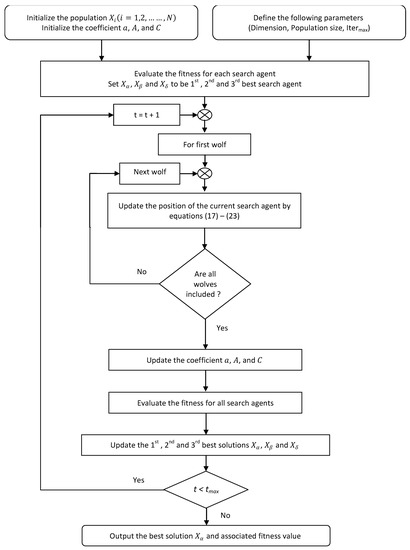 where is a component that decreases linearly from 2 to 0 throughout the iterations, and and are both random vectors defined as . Equations (13) and (14) indicate that the grey wolf can update its position randomly around the prey.