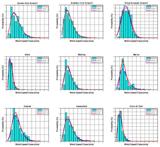 In Jordan, interest in wind energy began in 1979 through the Royal Scientific Society (RSS) [34]. Since then, several studies have been conducted to evaluate wind energy resources [35,36,37,38,39,40,41,42,43,44,45,46,47,48,49,50,51,52]. Generally, the observed in these studies is that they are limited to the use of Weibull or Rayleigh distribution models.