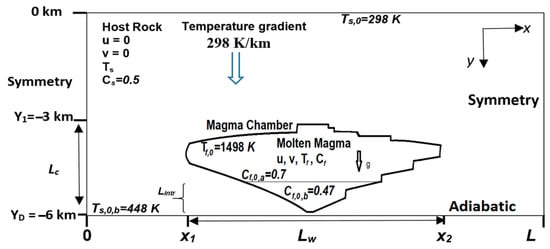 Three chamber shapes are simulated: rectangular (case 1), hybrid (case 2) and quasi-elliptical (case 3) []. In all cases, the chamber has the same volume of 18 km3, but varying widths. Figure 1 displays the magma chamber for the most complex case as suggested by previous work in the PCB (Humay unit) [,]. Geological data indicate that PCB plutons are commonly 5 km thick or less [,]. Analysis of saline inclusions in the PCB Linga complex suggests magma crystallization pressures between 800 and 900 bar, indicating that the depth to the top of the magma chamber was between 2.9 and 3.2 km from the Earth’s surface when crystallizing []. In this work we locate the top of the chamber at 3 km from the surface and use a maximum thickness for the chamber of 3 km (Lc = 3000 m).