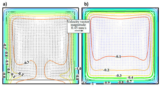 where the temperature must be entered in °C. The apparent viscosity varied from approximately 10 to 200 Pa s for a cooling range of 45–25 °C. These viscosity values are close to those of basaltic magma at temperatures between 1498 and 1473 K [] and a Prandtl number of 4 × 104 is close to the basaltic magma value []. It is important that the Prandtl number is close to that of basaltic magma since the theory of similarity between dimensionless numbers allows prediction of the same behavior of both fluids in terms of the amount of movement and heat transfer. This is very important for the validation of magmatic flows since the high temperatures at which they occur make their study very difficult in the laboratory. The two previous characteristics of the reference problem (viscosity and Pr number) allow us to confirm that the dimensionless solution for speeds and temperatures is comparable to those that occur in basaltic magmas. In Figure 2 velocity vectors and isotherms from [] are compared to those obtained in the present work after 1785 s using a mesh with 180 × 180 nodes.
