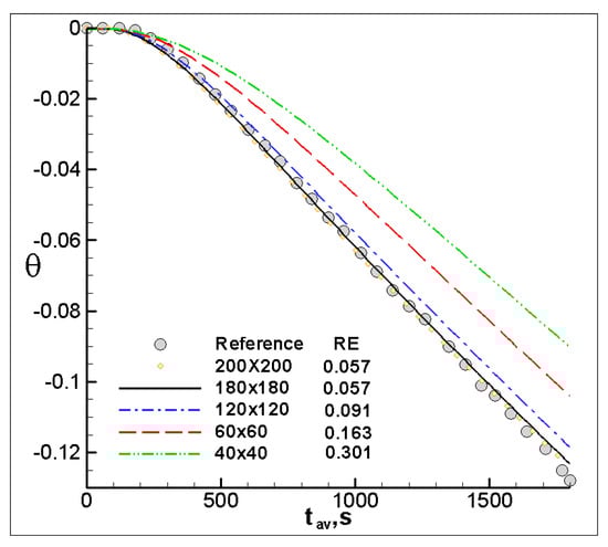 Time evolution of the average dimensionless fluid temperature for five meshes is compared with [] by using relative error (RE). Results were obtained using a constant temperature of outside the container for the first case in Section 3.1.