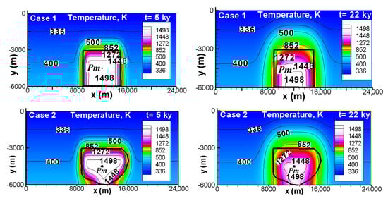 Temperature distributions at two different times inside the chamber and host rock for 1498 K and 1223 K correspond to magma (liquid and crystal mixture). Zones with temperatures lower than 1223 K are considered to be solid.