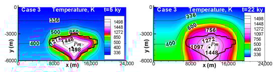 In general, the temperature profiles in Figure 5b show similar variations for the three cases and the two times, except for case 3 (near −6000 m) where the profile at x = 12,000 m is slightly displaced from the area where the chamber has its greatest depth (see Figure 4, case 3). After 22 ky the temperatures inside the chamber first drop in the extreme upper zone to values around 1000 K. The temperatures of the host rock have increased significantly to values around 375 K at a depth of one km from the surface. This is a little more than 50 K higher than the original temperature due to the geothermal depth gradient. At 300 m depth, the temperatures increase by about 10 K.
