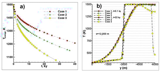 Figure 5 shows (a) the average temperature variation with time inside the chamber until the temperature drops below 1448 K at point Pm and (b) the temperature profile at x = 12,000 m for 0.1 ky and 22 ky. Figure 5a shows that average temperatures for case 1 decrease the slowest and case 3 cools down the fastest. The average temperatures after 40, 37 and 28 ky were 1215, 1156 and 1080 K for cases 1, 2 and 3, respectively. Cooling times are related to heat flow at the edges in contact with the host rock, which depends on the shape of the chamber. These contact areas are 18, 22.3 and 28.2 km2 for cases 1, 2 and 3, respectively. This in itself could explain why the cooling times in Figure 5a are different, but there is another reason. If the same boundary conditions were applied, similar heat losses should occur. However, the chambers have different shapes and this causes the edges of the chamber to come in contact with different temperatures of the host rock where the temperature increases by 25 K/km of depth. Fourier’s law indicates that the greatest heat flux at the host rock/chamber interface is found where there is the highest temperature gradient. In our case, this occurs when the host rock has lower temperatures (where the magma has a uniform initial temperature of Tf,0) at a shallower depth. Case 1 has less area exposed to high gradients, while cases 2 and 3 have larger exposed areas where the temperature gradient is high. These two reasons explain the large differences in temperature between the shapes studied and highlight the effect of chamber shape on the magma’s cooling times. Small batches of magma moving from hotter to colder regions in the upper crust can achieve thermal equilibrium in 1 ky, while larger igneous systems with spatial scales of 10–100 km may have lifetimes of 100 to 10,000 ky [].