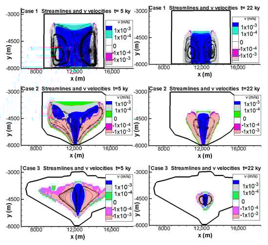 Figure 6 shows the streamlines and velocities in the vertical v-direction within the chamber at two different times for the cases studied. Streamlines in Figure 6 are in the temperature zones above 1223 K (solidus temperature). In all three cases, natural convection produces movement of the magma. For the two times presented, the v velocities do not exceed 1.4 × 10−3 m/s or 31.5 km/y. Maximum velocities are observed near the lateral wall. In general, the lower local resultant velocities are in the range of 0.32–0.032 km/y. This means that in 100 years an element of the magma travels at least one complete revolution in the chamber. Case 1 is the one that retains the most heat and therefore has the most movement. Two big vortices are produced in the fluid zone in all cases. In cases 2 and 3, streamlines show the effects of the chamber shape. This is best seen at 5 ky when the fluid area is still large.