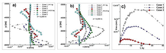 Figure 7a,b show the velocity profiles at x = 12,000 m. The absolute value of the velocities u and v are low at 9 × 10−4 m/s or less. Velocities within the chamber in each case are distributed in a different form. Cases 2 and 3 show positive and negative values of u and v. The velocities are displaced with time due to the solidification front for case 3. The velocity profile in case 3 has no contact with the lower part of the chamber; this produces velocities of zero near the bottom of the chamber. For this profile, case 1 displays the lowest velocities of the three studied cases. The time evolution of the average resulting velocity (Vres) in the chamber is shown in Figure 7c. The Vres increases rapidly during the first years of cooling. Only in case 1 is the Vres value (1.1 × 10−3 m/s) near the maximum calculated by Equation (11) (U0 = 1.4 × 10−3 m/s). The maximum Vres are 5.5 × 10−4 and 1.6 × 10−4 m/s for cases 2 and 3, respectively. The Vres decreases with: case 1 > case 2 > case 3, which is consistent with the temperature decrease for the studied chambers.