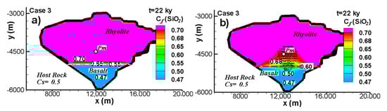 A sensibility analysis was made by carrying out several simulations using artificial diffusion coefficients of 1 × 10−11 to 1 × 10−6 m2/s. Results show that the minimum diffusivity necessary to observe diffusion of silica in the chamber is around 1 × 10−8 m2/s (Le = 16). The result obtained using a hypothetical value for the diffusivity coefficient of D = 1 × 10−8 m2/s is presented at 22 ky in Figure 8b. The advection–diffusion transport mechanisms change the concentration of SiO2 while the magma is in the liquid phase. This occurs mainly in the first 10 ky of cooling. Figure 8b shows the variation in concentration level near the boundary between basalt and rhyolite. The SiO2 content increases in the zone where initial basaltic magma intrudes. The rhyolite composition decreases from 0.70 to 0.60 and the basalt composition increases from 0.47 to 0.50 near the boundary interface between rhyolite and the basalt intrusion.