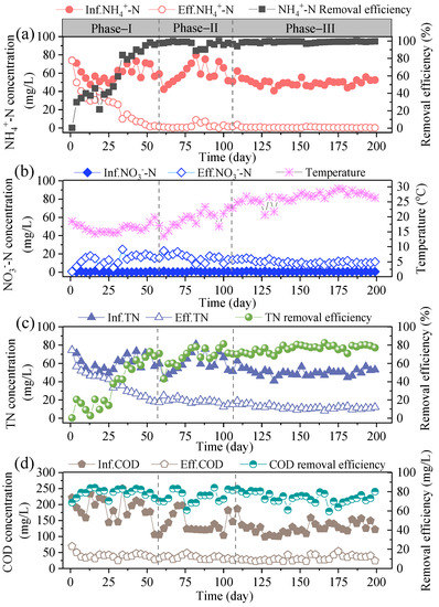 Phase I: Biofilm formation (day 1–58). New carriers were added into both the anoxic and aerobic zone. It was expected that the heterotrophic denitrifying organisms and nitrifying bacteria could be enriched by biofilm formation [31]. The recycling effluent contained NO3−-N and the carbon source in raw water could provide favorable conditions for denitrifying bacteria in anoxic zones.