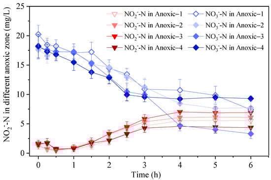 Gradual NO2−-N accumulation along with NO3−-N reduction was observed (Figure 4). The NO2−-N accumulation rates were much higher during the first three hours and then decreased. The accumulated NO2−-N concentration achieved a steady level after four hours. The NO2−-N accumulation efficiency in the second anoxic zone was the highest, and the last anoxic zone showed the lowest value, corresponding to the NTR in the four anoxic zones of 63.8%, 71.7%, 68.9%, and 59.3%, respectively. This would be related to the higher microbial community for NO3−-N reduction when the water flows into anoxic-2 after anoxic-1, which would improve the denitrification activity of the biomass in anoxic-2. Moreover, the organic carbon source decreased to the lower level in anoxic-3 and anoxic-4 compared to anoxic-2, resulting in a decreased NO3−-N reduction efficiency and NO2−-N generation. This indicated that the HRT and organic carbon source could play important roles in the development of the PD/A process. Results of this study proved that the partial denitrification with stable NO2−-N generation could be achieved successfully in a continuous-flow biofilm system, thus providing a meaningful method to achieve mainstream anammox in practical application.