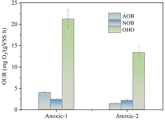 Oxygen uptake rates of AOB, NOB, and OHO in the biomass taken from anoxic biofilms.