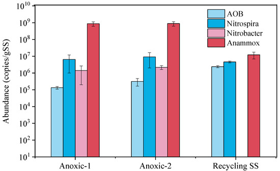 The abundance of functional bacteria including AOB, NOB, and anammox bacteria were analyzed by qPCR. In addition, the functional bacteria in suspended biomass returned to anoxic zones by recycling biomass were also investigated.