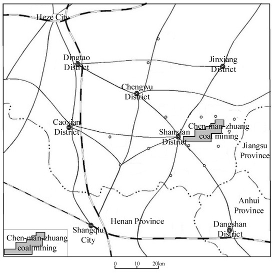 The Chen-man-zhuang underground mining project is situated in the East of Shanxian Coalfields in Heze City of Shandong Province, China. The center of the Chen-man-zhuang project is 16 km away from Shanxian and 90 km from Heze Economic Development Zone, which is shown in Figure 1. It is also interconnected by an excellent highway system with quick access to Jiangsu Province, Henan Province, and Anhui Province.