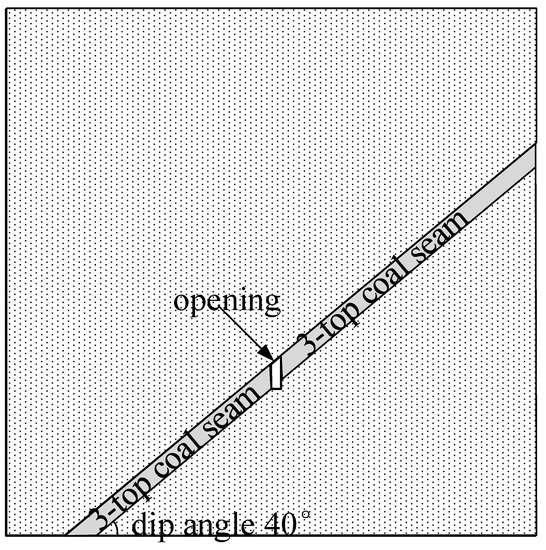 It is reported that the recoverable reserves of coal seam are 50.766 million tons, and the average thickness of coal seam is more than 3.50 m in the Chen-man-zhuang project. The total mining area of the Chen-man-zhuang project is 25.69 km2. There is a coal seam named 3-top coal seam, which is 3.50 m thick and at a depth of 900 m. It belongs to steeply inclined seam with an average inclined dip angle of 40°. The immediate roof of 3-top coal seam is mudstone with 0.9–1.3 m thick and low strength, and the main roof is full medium sandstone with high strength. The floor of 3-top coal seam is mudstone with low strength, and contains small amounts of sandstone. The opening often needs to be excavated before mining the coal resource. In this project, the opening in 3-top coal seam is designed for mining the coal resource in 3402 working face. According to the characteristics of steeply inclined seam and the common design method in this mining project, the opening is designed to be a right-angle trapezoidal shape, which is shown in Figure 2. Based on the previous mining experience in this project, there is always great deformation and invalid bolt supporting because of the steeply inclined rock (seam) and low strength of floor and roof for the opening. Therefore, it is very important to predict the deformation and provide a bolt supporting scheme for the opening before mining, which can provide the basis for safety mining.