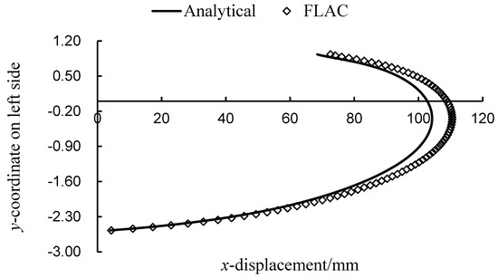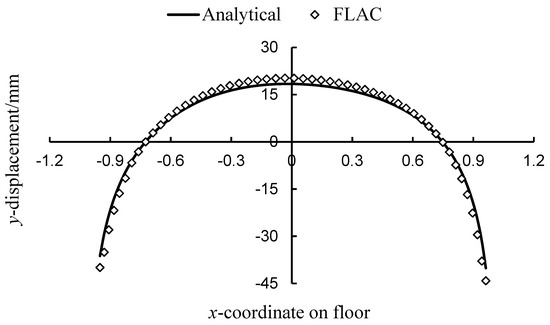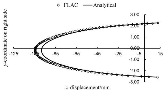 By setting the Young’s modulus E = 1.5 GPa and the Poisson’s ratio μ = 0.16 according to laboratory testing with the rock specimen from the Chen-man-zhuang mining project, the displacements on opening boundary can be obtained with the computational software (e.g., Matlab, Mathcad, Maple, etc.) according to the implementation of Equation (20) or (21). Geotechnical engineers have begun to take advantage of the results of elasticity theory in rock mechanics or rock engineering applications. The displacements on the boundary of right-angle trapezoidal openings are illustrated below for the applications in rock engineering or mining engineering. Meanwhile, the numerical model in FLAC software was developed for comparing the results of displacement according to the analytical elastic solution. The length of numerical model in horizontal and vertical direction is 100 m and 100 m, respectively; the overall mesh of numerical model is 500 × 500. The constraints on the left and right boundary of the numerical model are both that the horizontal displacement is equal to zero, while the constraint on the bottom of the numerical model is that the vertical displacement is equal to zero. Uniform loading is applied on the top of the numerical model to simulate the load of overlying strata. The value of the Young’s modulus E and Poisson’s ratio μ in numerical model is the same with the value in analytical computation, respectively.