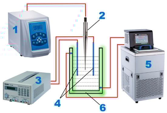 Experimental device 1—ultrasonic cell pulverizer, 2—ultrasonic horn, 3—DC power supply, 4—platinum sheet electrode, 5—low temperature and constant temperature distiller’s grains, 6—jacket beaker reactor.
