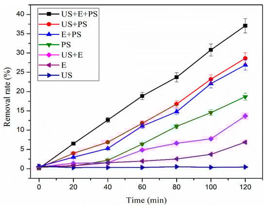 The removal effect of ciprofloxacin by the seven systems is shown in Figure 3. It can be seen from the figure that the system of US/E/PS shows the best degradation effect, and the pseudo-first-order reaction rate constant was 0.0046 min−1, which is about 2.7 times that of persulfate oxidation alone (0.0017 min−1). Under the experimental conditions, the removal rate of ciprofloxacin was 37.4%. The combination of US, E, and PS has a strong synergistic effect (the synergistic coefficient S of US/E/PS reaction system is equal to 2.10).