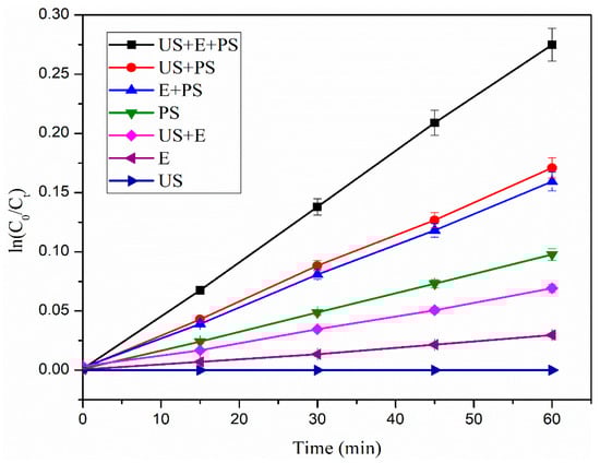 Experimental conditions: the pH was 5.0, initial molar concentration of ciprofloxacin was 0.03 mmol/L, initial molar concentration of PS was 1.5 mmol/L, ultrasonic power was 100 W, electrode potential was 4 V, and temperature was 35 °C. Firstly, under this experimental condition, the removal effect of ciprofloxacin by different reaction systems was compared, such as blank, ultrasonic oxidation alone (US), electro-oxidation alone (E), persulfate oxidation alone (PS), ultrasound-activated persulfate oxidation (US/PS), electro-activated-persulfate oxidation (E/PS), ultrasound-enhanced electro-oxidation (US/E), and ultrasound-enhanced electro-activated persulfate oxidation (US/E/PS). The degradation effects of ciprofloxacin by the eight different reaction systems were carried out for 120 min. Results are shown in Figure 2 (C0 was the initial molal concentration of substrate ciprofloxacin, and Ct was the molal concentration at reaction time t). Compared with ultrasonic oxidation alone and electro oxidation alone, the removal rate of ciprofloxacin was greatly increased after PS was added. The removal rate of ciprofloxacin by US/PS was 28.5% higher than that by ultrasonic oxidation, and the removal rate by E/PS was 27.1% higher than that under electro oxidation alone. This shows that the removal of ciprofloxacin by US and electro oxidation alone is very weak, and the removal of ciprofloxacin mainly depends on the oxidation of . It is worth noting that the contribution of US/E to ciprofloxacin removal was better than that of ultrasonic oxidation and electro oxidation alone, which indicates that the combination of US and electro oxidation promotes the production of •OH and other active substances and has a strong synergistic effect []. The quasi-first-order reaction kinetics fitting curves of ciprofloxacin by different reaction systems were also investigated.