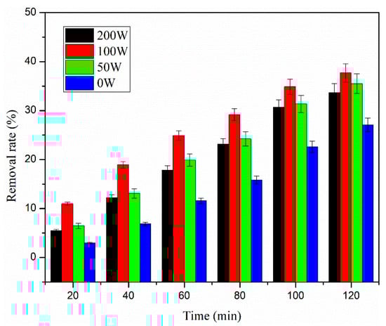To investigate the effect of ultrasonic power on the removal of ciprofloxacin by ultrasonic enhanced electro-activated persulfate system, the experimental conditions were set as follows: ciprofloxacin’s initial molar concentration was 0.03 mmol/L, PS initial molar concentration was 1.5 mmol/L, the initial pH value was 5.0, the electrode potential was 4 V, the reaction temperature was 35 °C, and ultrasonic power was adjusted to 0 W, 50 W, 100 W, and 200 W. After reaction for 120 min, the experiment results are shown in Figure 4.