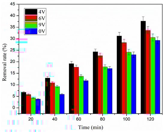 To investigate the effect of electrode potential on the removal of ciprofloxacin by US/E/PS, the experimental conditions were set as follows: ciprofloxacin’s initial molar concentration was 0.03 mmol/L, PS initial molar concentration was 1.5 mmol/L, initial pH was 5.0, ultrasonic power was 100 W, reaction temperature was 35 °C, and electrode potentials were adjusted to 0 V, 4 V, 6 V, and 9 V, respectively. The reaction was carried out for 120 min and the removal effect of ciprofloxacin was observed (Figure 5). When the electrode potentials were 0 V, 4 V, 6 V, and 9 V, the removal rates of ciprofloxacin were 28.5%, 37.4%, 33.5%, and 30.5%, respectively. It can be seen that electrifying the reaction system is helpful for ciprofloxacin removal, but with the increase in electrode potential, the removal effect of ciprofloxacin shows a downward trend []. The reason for the result is that, after activation,  gains electrons on the surface of the cathode electrode to produce , which increases the active material in the system and accelerates the removal []. However, when the electrode potential increases to a certain degree, the current efficiency decreases, the energy utilization decreases, and the removal effect of organic matter is weakened instead.